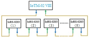 本產(chǎn)品所有節(jié)點(diǎn)包括IoTM-02 VIII和8個IoRS-0203都以手挽手模式組成一個通訊閉環(huán):IoTM-02 VIII的“RS出”接口與第一個IoRS0203的“RS485 In”接口相連接,中間IoRS-0203的“RS485 Out”接口分別與下一個IoRS的“RS485 In”相連,以此類推,并且最后一個IoRS-0203的“RS485 Out”接口與IoTM-02 VIII的“RS入”相連,這樣形成一個通訊閉環(huán)。